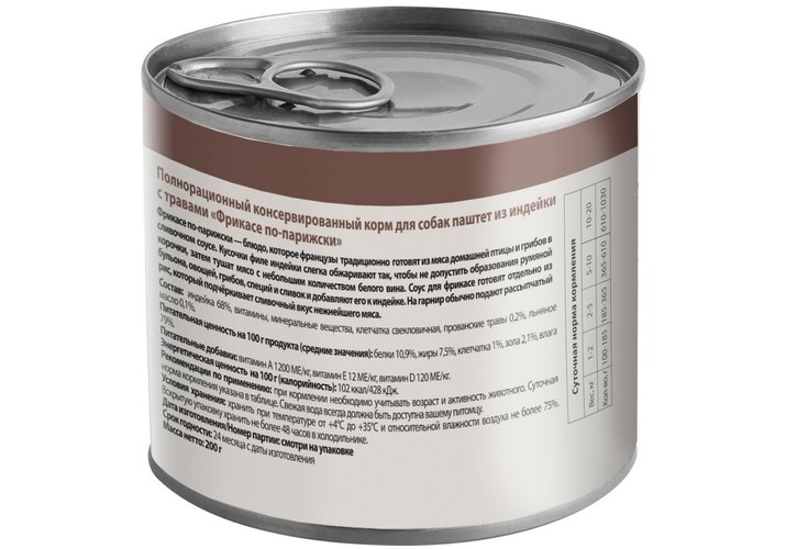 Полнорационный консервированный корм для собак "Фрикасе по-парижски".