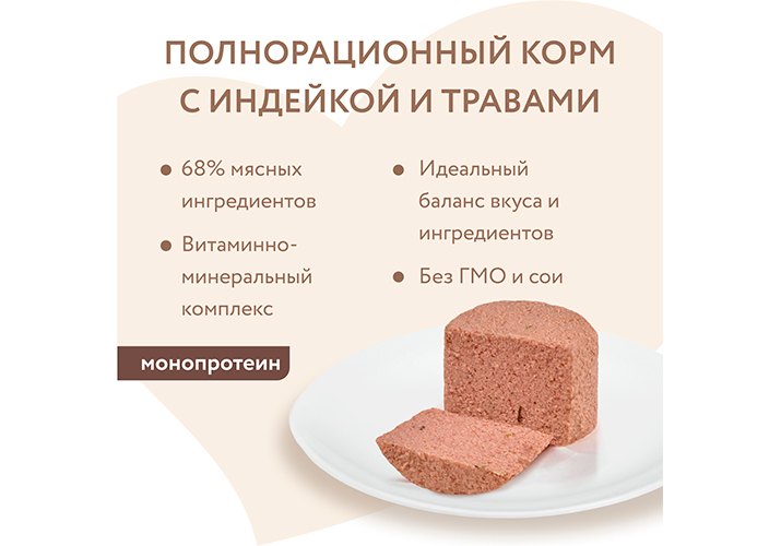 Индейка 68%, витамины, минеральные вещества, свекловичная клетчатка, прованские травы 0,2%, льняное масло 0,1%