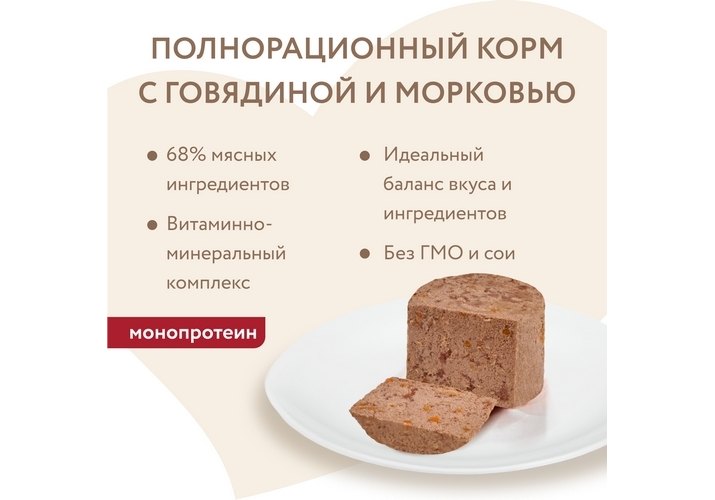 Говядина 68%, морковь 4%, витамины, минеральные вещества, свекловичная клетчатка, льняное масло 0,1%.