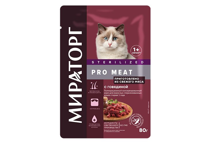 Мираторг Pro Meat Sterilized Влажный корм Паучи для Стерилизованных кошек с Говядиной (цена за упаковку) 80г х 24шт