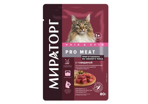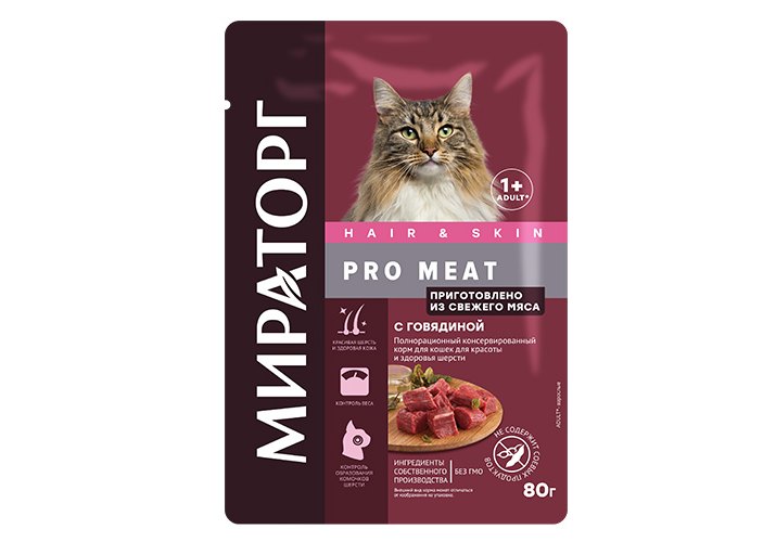 Мираторг Pro Meat Hair & Skin Влажный корм Паучи для взрослых кошек для Красоты и здоровья шерсти с Говядиной (цена за упаковку) 80г х 24шт