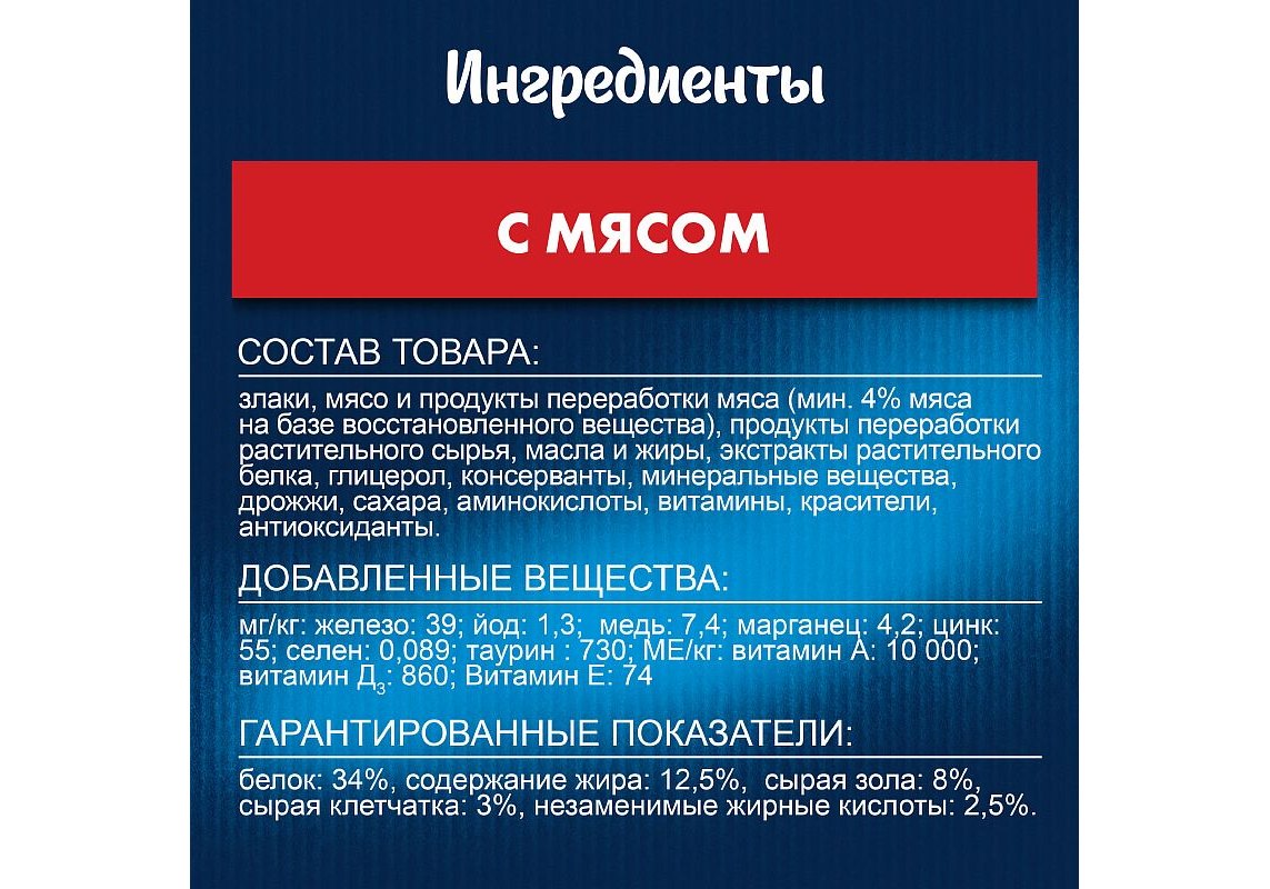 Железо: 39; йод: 1,3; медь: 7,4; марганец: 4,2; цинк: 55; селен: 0,089; таурин : 730; МЕ/кг: витамин А: 10 000; витамин Д3: 860; Витамин Е: 74.