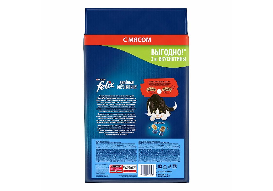 FELIX ДВОЙНАЯ ВКУСНЯТИНА Сухой корм Пурина Феликс для взрослых кошек с мясом 3 кг