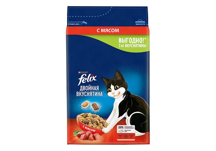 Сухой корм FELIX® Двойная Вкуснятина® для взрослых кошек, с мясом. Любопытство Вашего кота заложено природой! И бренд FELIX® снова придумал, как его удовлетворить. Представляем FELIX® Двойная Вкуснятина® – сухой корм для кошек, который полностью соответствует потребностям Вашего озорника. Восхитительное сочетание двух текстур в одной упаковке: хрустящие гранулы смешаны с мягкими кусочками для создания невероятного вкуса, перед которым невозможно устоять! Широкий ассортимент позволит коту наслаждаться разнообразием мясных или рыбных вкусов с соблазнительными ароматами. Felix® Двойная Вкуснятина® - первый сухой корм, созданный под брендом FELIX® для находчивого кота, который знает толк во вкусной еде.