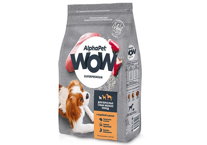 Сухой полнорационный корм с индейкой и рисом для взрослых собак мелких пород AlphaPet WOW® Superpremium.