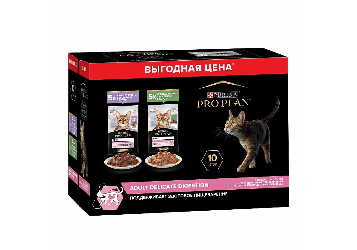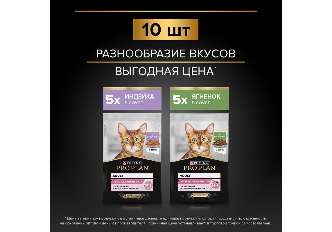 PRO PLAN DELICATE Влажный корм Паучи ПРО ПЛАН для кошек с Чувствительным пищеварением Индейка в соусе Ягненок в соусе (цена за упаковку) 85г х 10шт