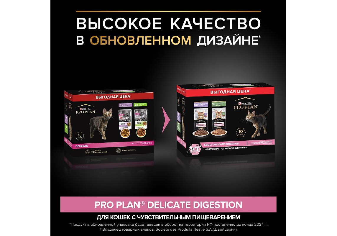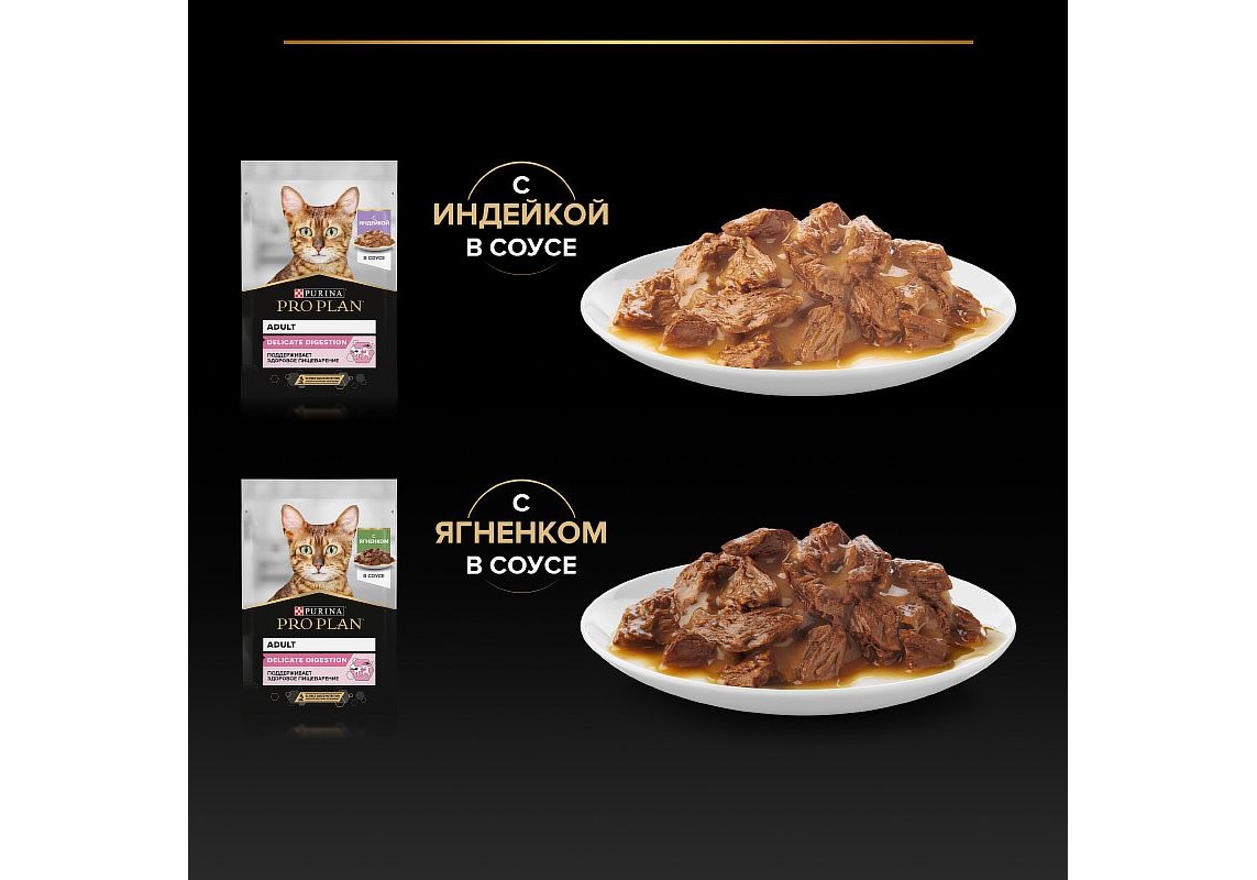 1. Влажный корм PRO PLAN® Adult DELICATE DIGESTION для взрослых кошек с чувствительным пищеварением или с особыми предпочтениями в еде, с индейкой в соусе 85 г: