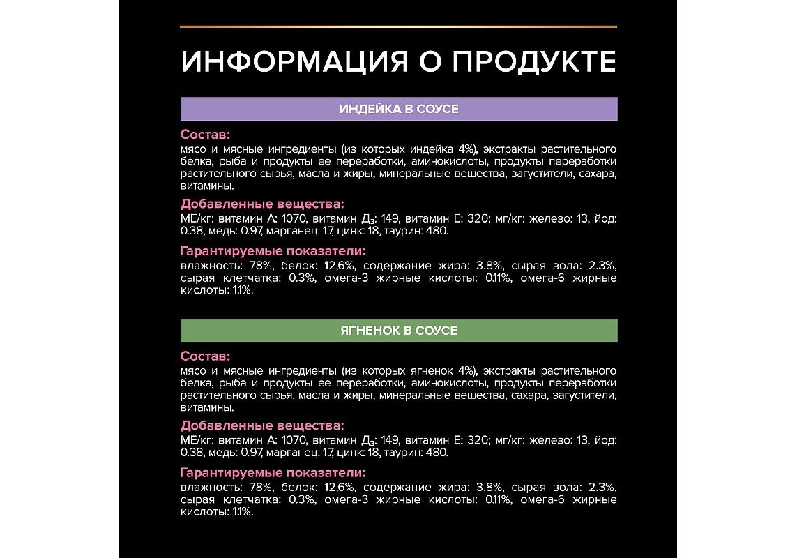 Мясо и мясные ингредиенты (из которых ягненок 4%), экстракты растительного белка, рыба и продукты ее переработки, аминокислоты, продукты переработки растительного сырья, масла и жиры, минеральные вещества, сахара, загустители, витамины.