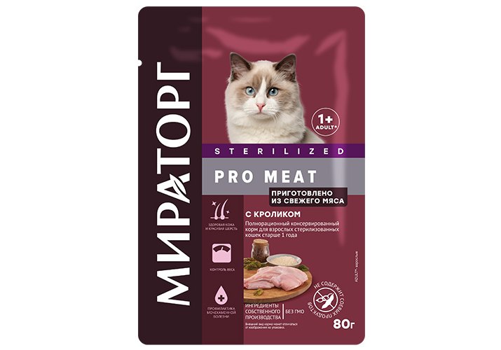 Мираторг Pro Meat Sterilized Влажный корм Паучи для Стерилизованных кошек с Кроликом (цена за упаковку) 80г х 24шт