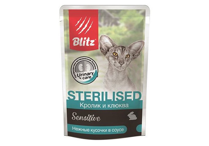 Blitz Sensitive Urinary Care Sterilised Паучи Блиц для взрослых Стерилизованных кошек Кролик и клюква кусочки в соусе (цена за упаковку) 85г х 24шт