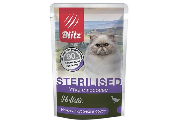 Blitz Holistic Sterilised Duck Паучи Блиц для Стерилизованных кошек Утка с лососем кусочки в соусе (цена за упаковку) 85г х 24шт