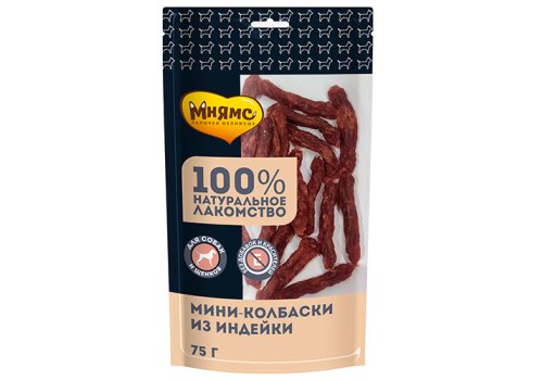 Мнямс лакомство для собак Мини-колбаски из индейки - вкусное и полезное лакомство для собак мелких и средних пород, а также щенков старше 3-х месяцев с высоким содержанием белка, незаменимыми аминокислотами, витаминами и минералами.