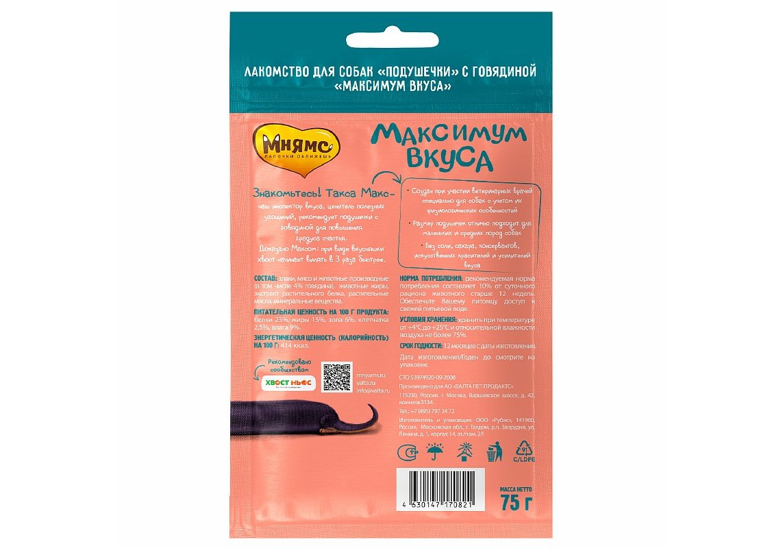 Такса Макс – наш инспектор вкуса, ценитель полезных угощений, рекомендует подушечки с говядиной для повышения градуса счастья.