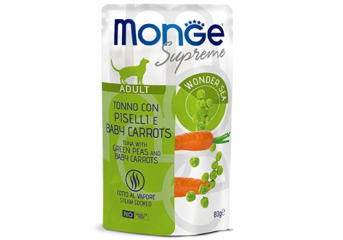 Monge Supreme Adult Tuna with grees peas and baby carrots Влажный корм Паучи Монж для взрослых кошек Тунец с зеленым горошком и мини-морковью (цена за упаковку) 80г x 24шт