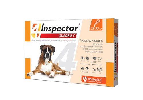 Inspector Quadro С Капли Инспектор от Внешних и Внутренних паразитов для собак весом от 25 до 40 кг 1 х 3шт