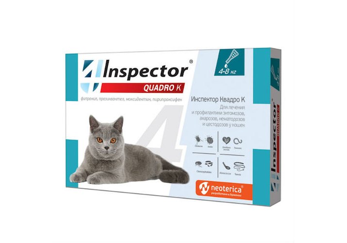 Inspector Quadro К Капли Инспектор от Внешних и Внутренних паразитов для кошек весом от 4 до 8 кг 1 х 3шт