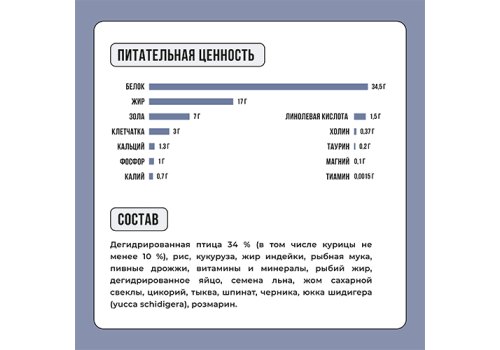 Дегидрированная птица 34 % (в том числе курицы не менее 10 %), рис, кукуруза, жир индейки, рыбная мука, пивные дрожжи, витамины и минералы, рыбий жир, дегидрированное яйцо, семена льна, жом сахарной свеклы, цикорий, тыква, шпинат, черника, юкка шидигера (yucca schidigera), розмарин.