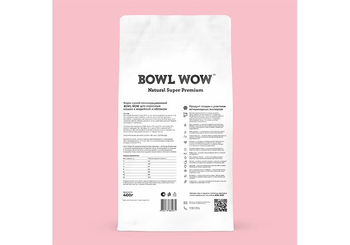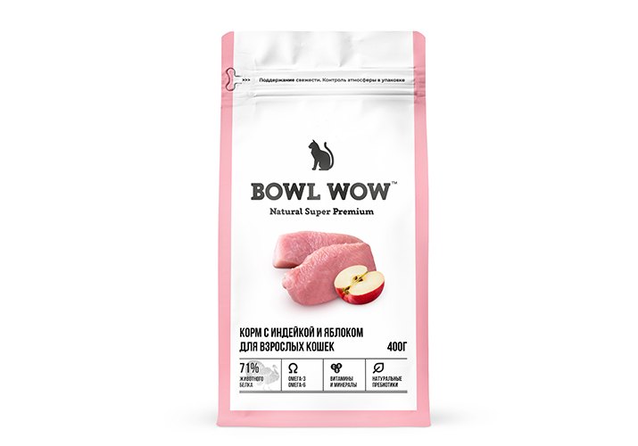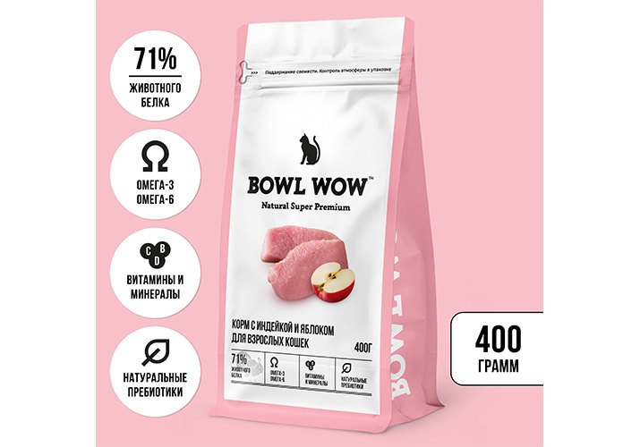 BOWL WOW Сухой корм Боул Вау для Взрослых кошек с Индейкой и яблоком 400 г
