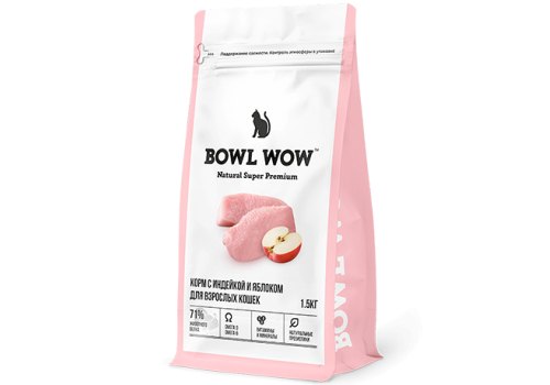 BOWL WOW Сухой корм Боул Вау для Взрослых кошек с Индейкой и яблоком 1,5 кг