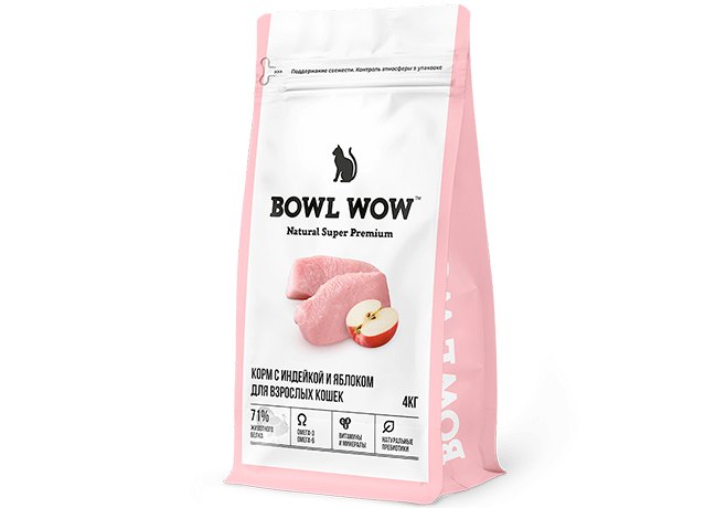 BOWL WOW Сухой корм Боул Вау для Взрослых кошек с Индейкой и яблоком 4 кг