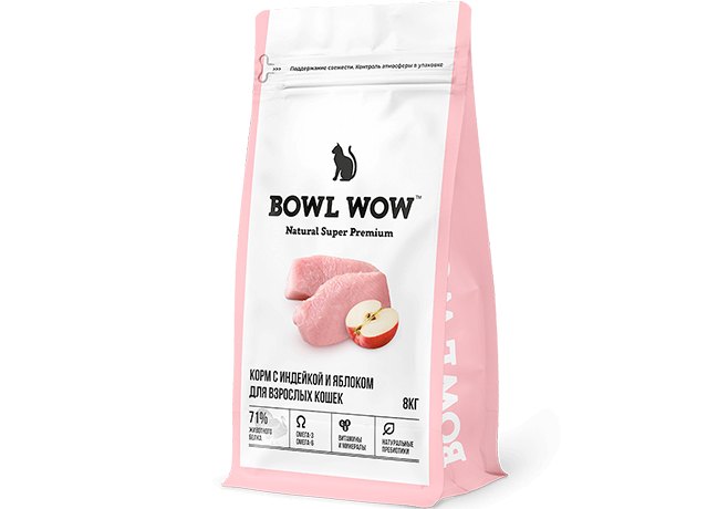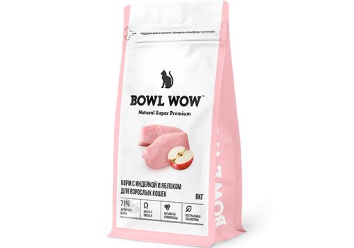 BOWL WOW Сухой корм Боул Вау для Взрослых кошек с Индейкой и яблоком 8 кг