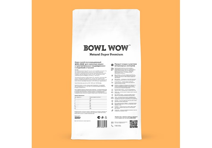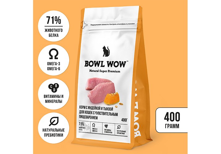 BOWL WOW Сухой корм Боул Вау для кошек с Чувствительным пищеварением с Индейкой и тыквой 400 г