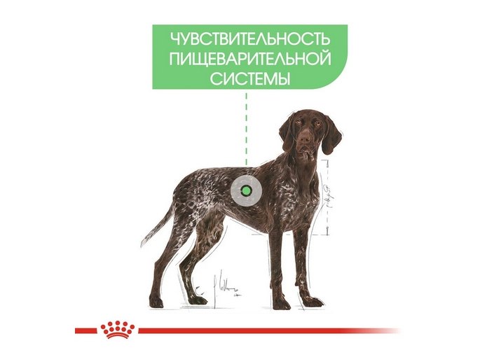 Полнорационный сухой корм для взрослых собак крупных размеров (вес собаки от 26 до 44 кг, возраст старше 15 месяцев) с чувствительной пищеварительной системой.