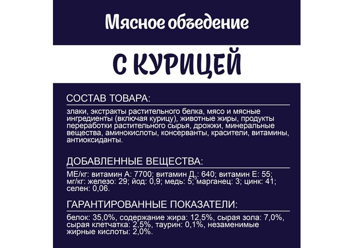 Белок: 35,0%, содержание жира: 12,5%, сырая зола: 7,0%, сырая клетчатка: 2,5%, таурин: 0,1%, незаменимые жирные кислоты: 2,0%.