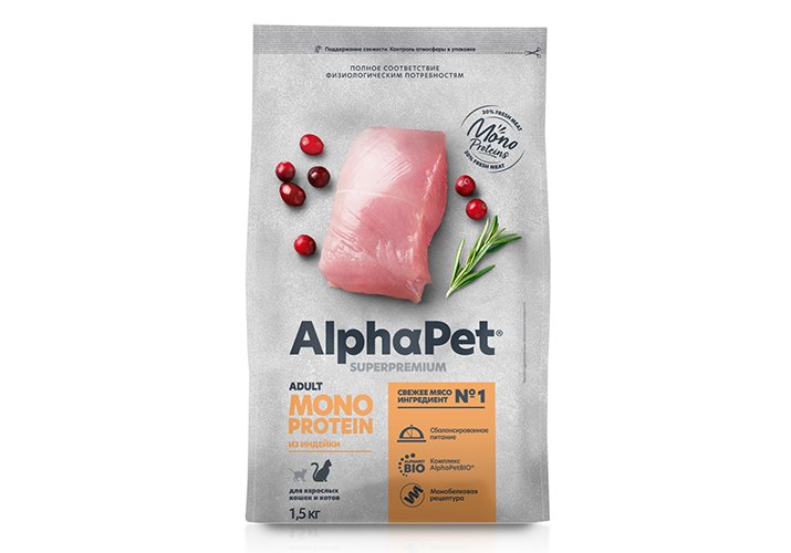 AlphaPet Superpremium Monoprotein Сухой корм АльфаПет для взрослых кошек Индейка 1,5 кг