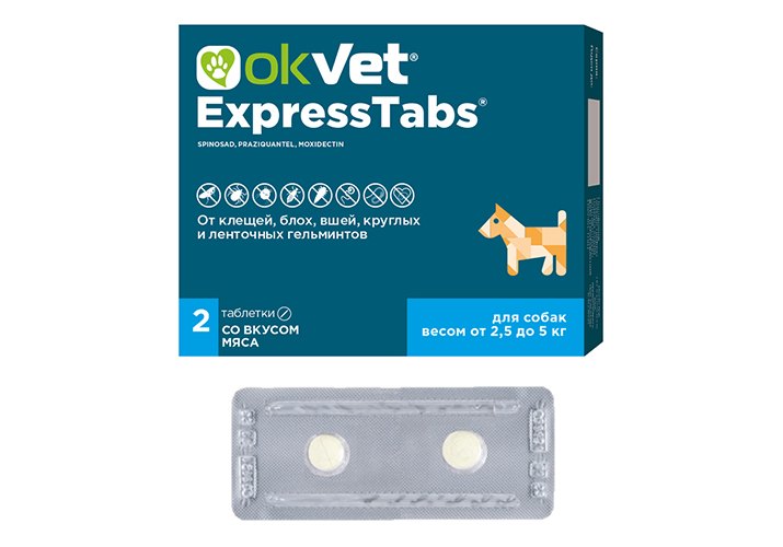Okvet ЭкспрессТабс Таблетки Оквет от Клещей Блох Вшей Круглых и Ленточных гельминтов для собак весом от 2,5 кг до 5 кг со вкусом мяса 2 таб