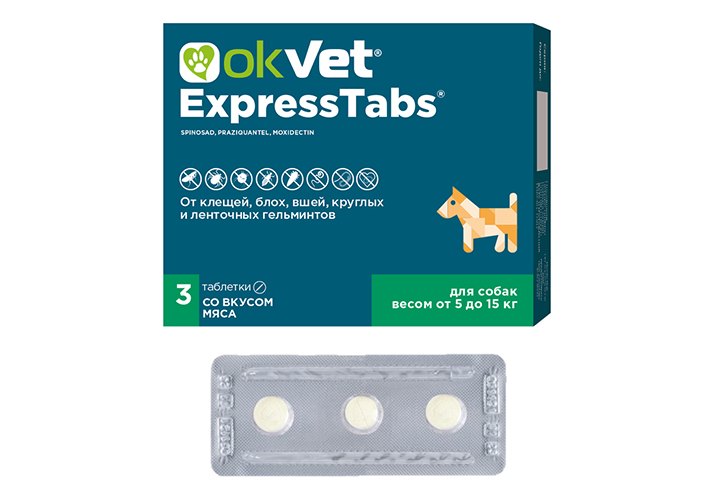Okvet ЭкспрессТабс Таблетки Оквет от Клещей Блох Вшей Круглых и Ленточных гельминтов для собак весом от 5 кг до 15 кг со вкусом мяса 3 таб