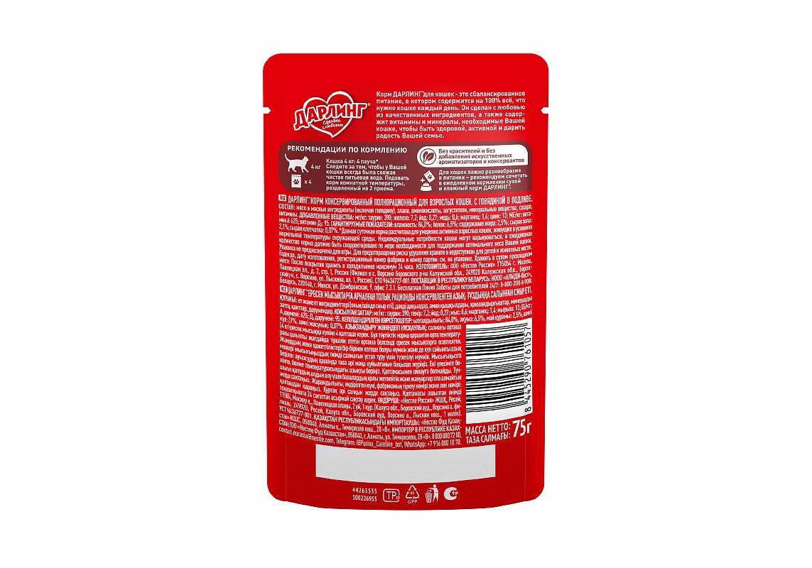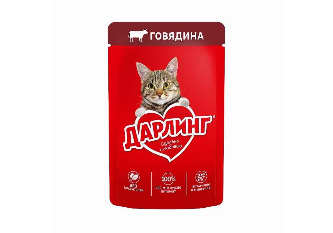 Дарлинг Влажный корм Паучи для взрослых кошек Говядина в подливе (цена за упаковку) 75г х 26шт