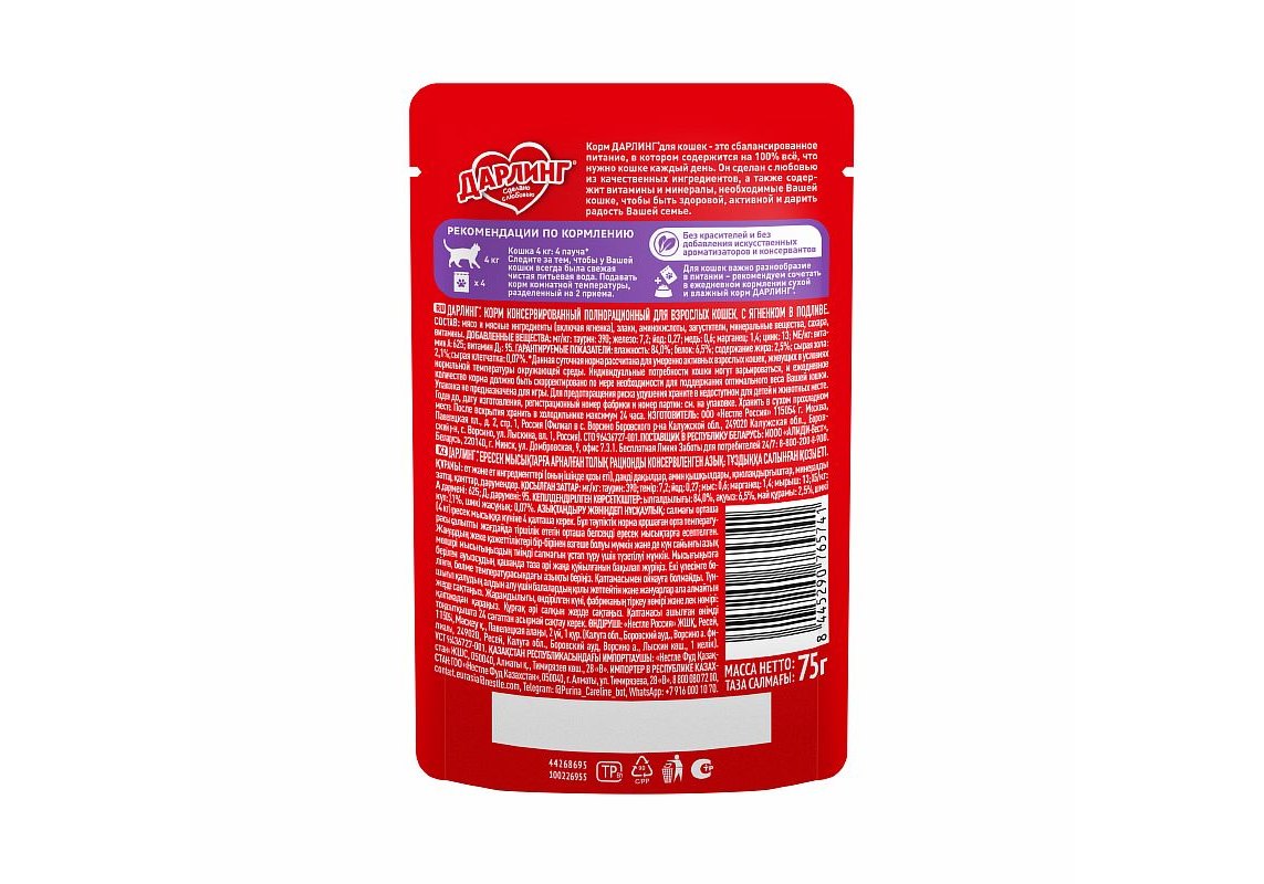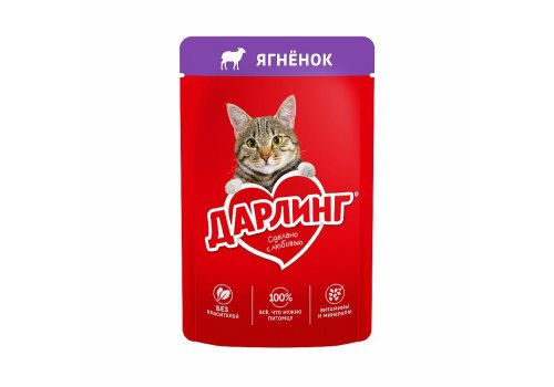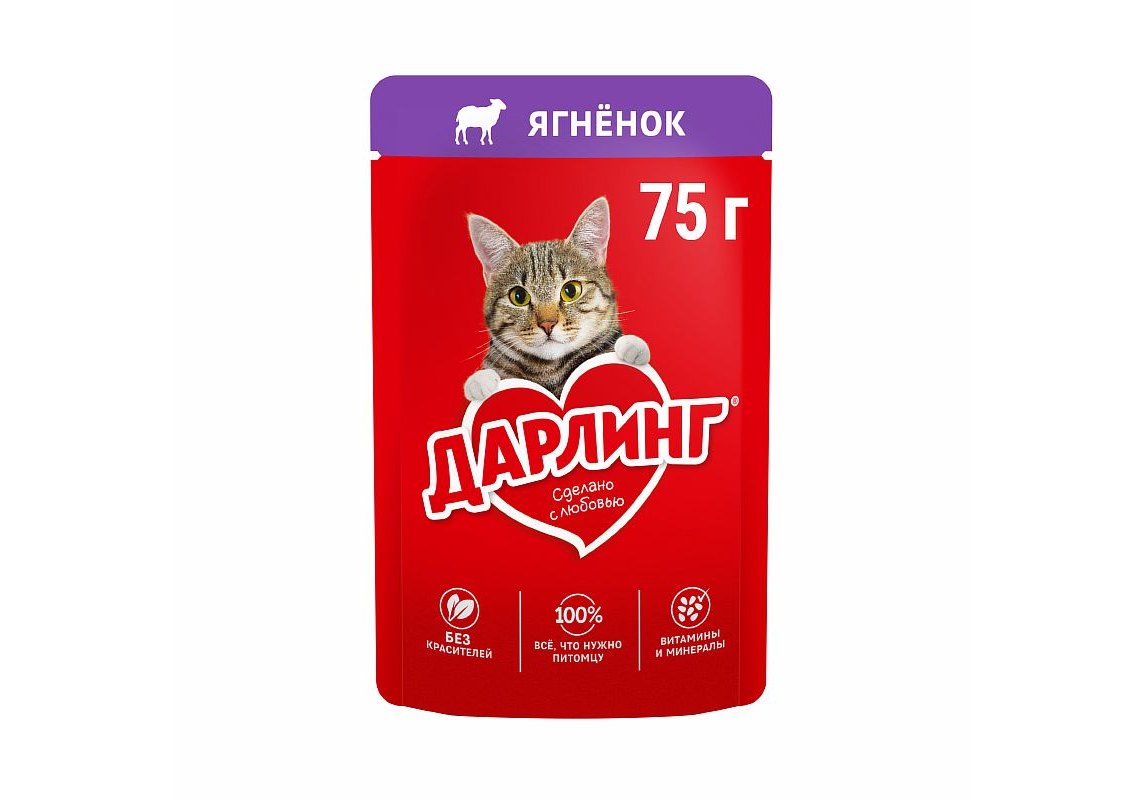 Дарлинг Влажный корм Паучи для взрослых кошек Ягнёнок в подливе (цена за упаковку) 75г х 26шт