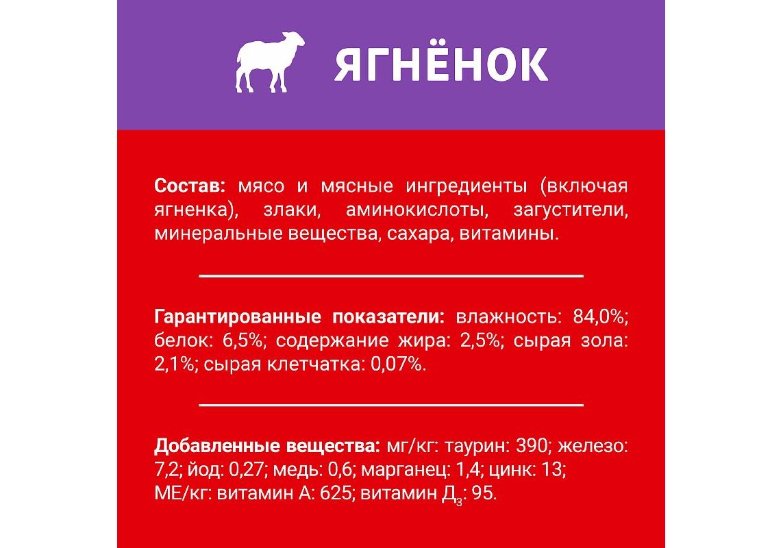 Мясо и мясные ингредиенты (включая ягненка), злаки, аминокислоты, загустители, минеральные вещества, сахара, витамины.