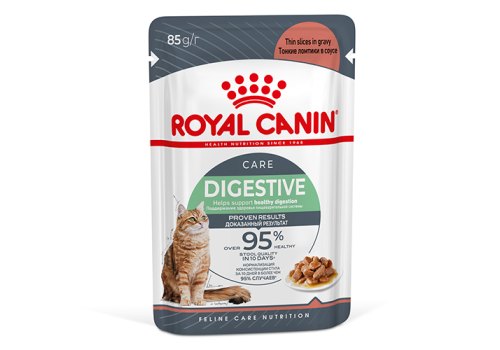 Корм консервированный полнорационный для взрослых кошек (тонкие ломтики в соусе) DIGESTIVE CARE (ДАЙДЖЕСТИВ КЭА) ROYAL CANIN®, мелкие кусочки в соусе, подходящий для взрослых домашних кошек в возрасте старше 1 года, специально разработан с учетом потребностей вашей кошки в питательных веществах.
