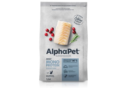 AlphaPet Superpremium Monoprotein Сухой корм АльфаПет для взрослых кошек Белая рыба 1,5 кг
