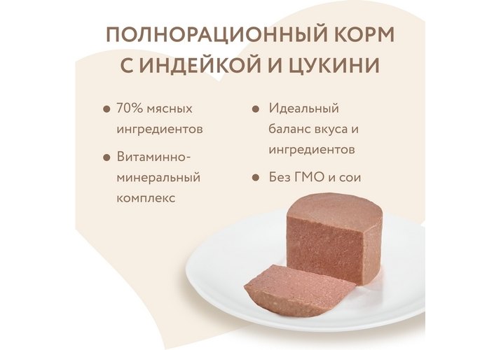 Индейка 35%, мясные субпродукты 26,5%, цукини 4%, молоко 4%, витамины и минеральные вещества, инулин.