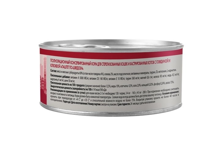 "Паштет по-шведски" содержит высокое количество животного белка (69%), клюкву, витамины и минералы, таурин, DL-метионин, L-карнитин, обеспечивающие контроль веса и снижающие риск развития мочекаменной болезни.