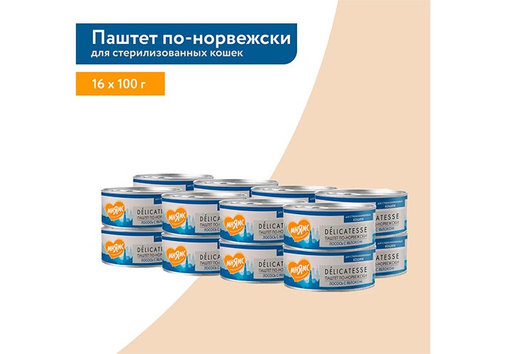 Мнямс Delicatesse Влажный корм Консервы для Cтерилизованных кошек Паштет по-норвежски Лосось с яблоком (цена за упаковку) 100г х 16шт