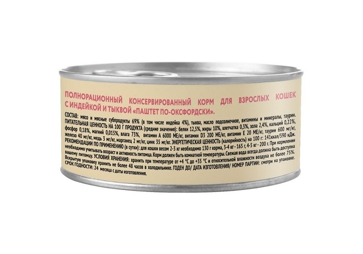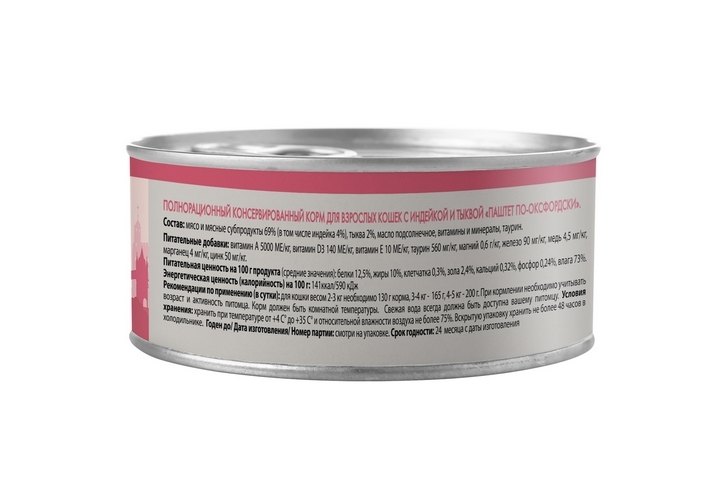 Паштет по-оксфордски" содержит высокое количество животного белка (69%), тыкву, таурин, а также все необходимые витамины и минералы для поддержания здоровья и активности кошки на протяжении всей ее жизни.