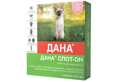 Apicenna ДАНА СПОТ-ОН капли для котят и кошек до 3кг на холку 2 пипетки по 0,5 мл