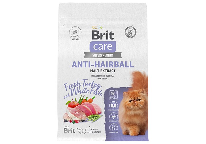 Brit Care Anti-Hairball Malt Extract Turkey White Fish Сухой корм Брит для взрослых кошек Выведение шерсти Белая рыба Индейка 400 г