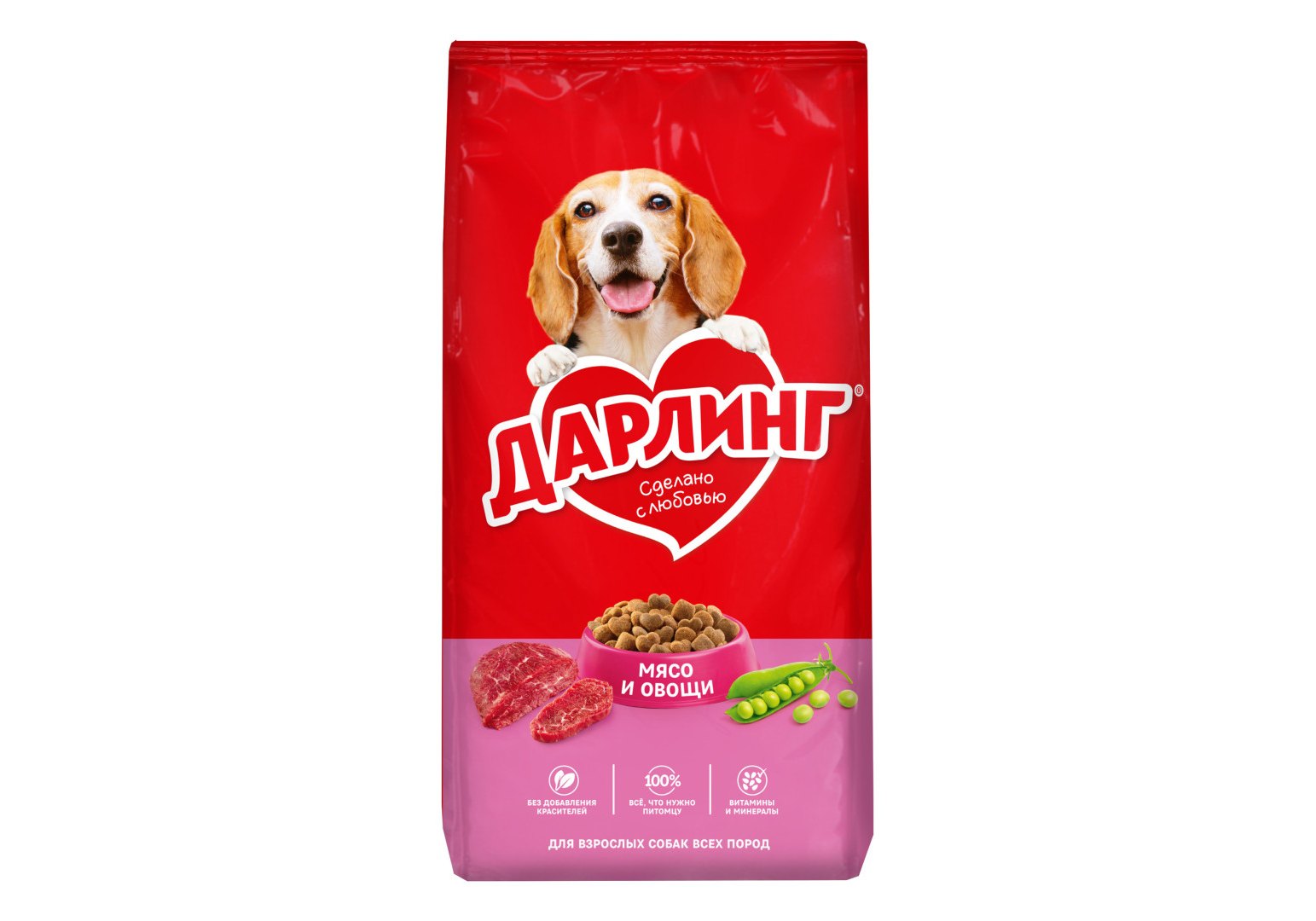 Корм ДАРЛИНГ для собак – это сбалансированное питание, сделанное с любовью, чтобы Вы могли заботиться о вашем питомце каждый день. Корм ДАРЛИНГ изготовлен из качественных ингредиентов, а также содержит витамины и минералы, необходимые Вашей собаке, чтобы быть здоровой, активной и дарить радость Вашей семье. Без добавления красителей.