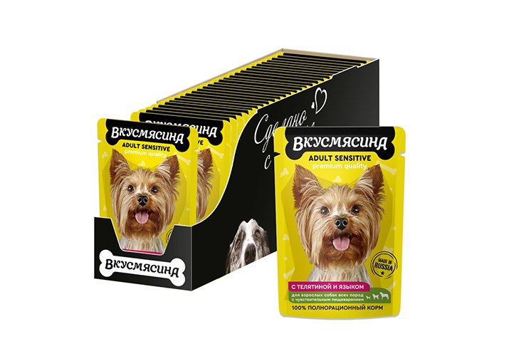 Вкусмясина Влажный корм Паучи для собак с Чувствительным пищеварением Кусочки с Телятиной и языком в соусе (цена за упаковку) 85г х 30шт