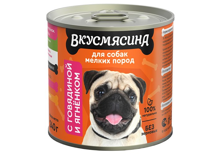 Вкусмясина Влажный корм Консервы для собак Мелких пород с Говядиной и ягненком (цена за упаковку) 240г х 6шт