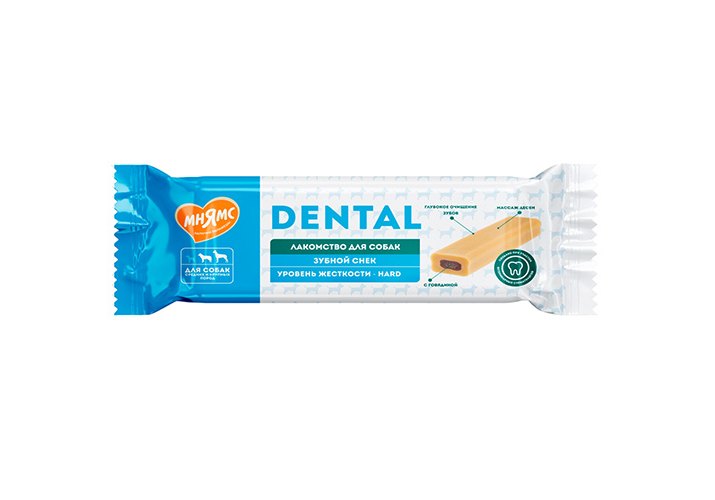 Мнямс DENTAL "Зубной снек" с говядиной – вкусное и полезное лакомство для взрослых собак крупных пород и щенков крупных пород старше 3-х месяцев.