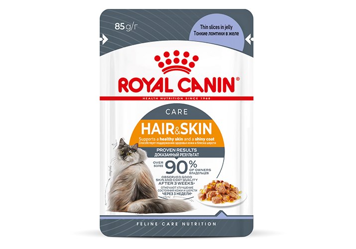 Royal Canin Hair & Skin Care Jelly Влажный корм (Консервы-Паучи) Роял Канин Хэйр & Скин Кэа для кошек Здоровая кожа и шерсть в Желе (цена за упаковку) 85г х 28шт