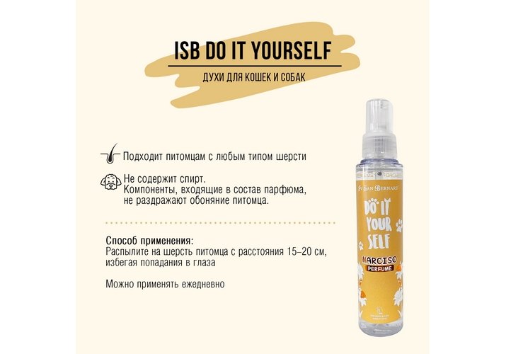 ISB DO IT YOURSELF Парфюм Narciso 125 мл Духи для кошек и собак с нежными нотками свежего аромата. Не содержат спирта, компоненты, входящие в состав парфюма, не раздражают обоняние питомца.