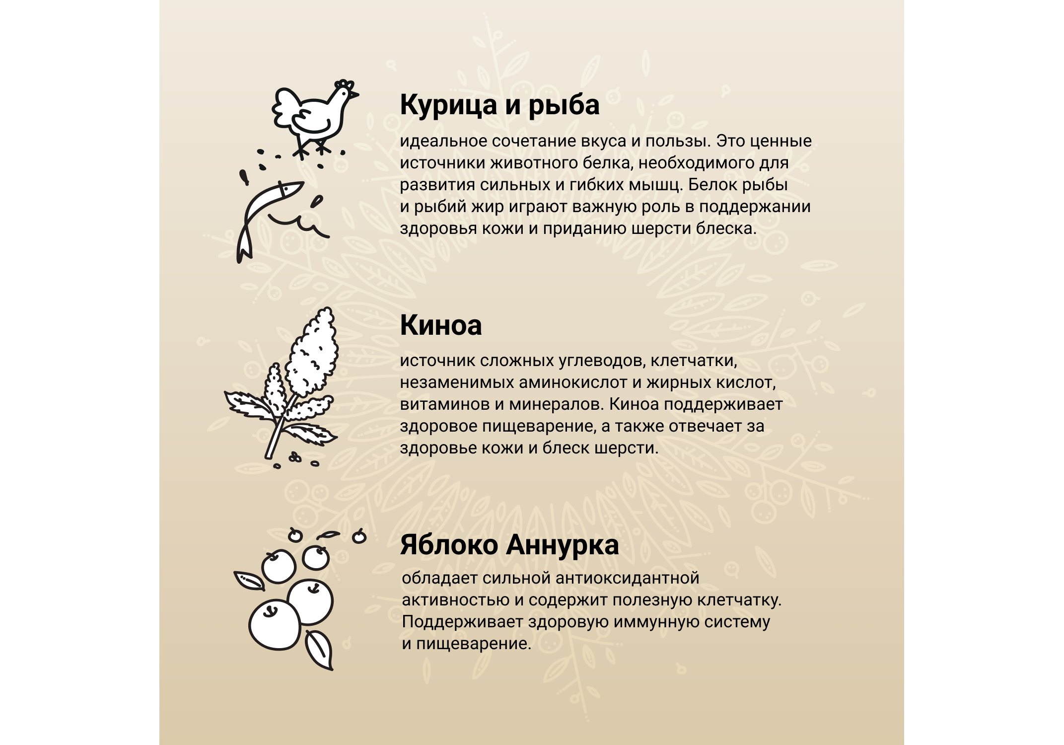 Сырая курица (20%), гороховый крахмал, дегидратированный куриный белок (11%), дегидратированный белок сельди (11%), сельдь (8%), лосось (8%), куриный жир, рыбий жир (лососевый), киноа (4%), гидролизованный рыбий белок (треска, пикша), гидролизованные белки птицы (курица, индейка), куриные потроха (печень, сердце, почки), сухое яйцо (куриное), льняное семя, сухая свекольная пульпа, люцерновая мука, волокна гороха, сушеная черника (0,5%), инулин цикория (0,4%), дрожжевой экстракт (источник маннанолигосахаридов) (0,3%), фруктоолигосахариды (0,3%), сушеная клюква, сушеная ацерола, сушеная яблоко Аннурка, сушеная спаржа, сушеная тыква, аскофиллум узловатый (Ascophyllum Nodosum), карбонат кальция, монокальцийфосфат, хлорид калия, хлорид натрия, сухие пивные дрожжи, розмарин, куркума, календула, семена и шелуха подорожника, юкка Шидигера.