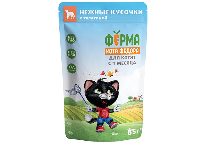 Ферма кота Фёдора Влажный корм Паучи для Котят с 1 месяца Нежные кусочки с Телятиной (цена за упаковку) 85г х 24шт